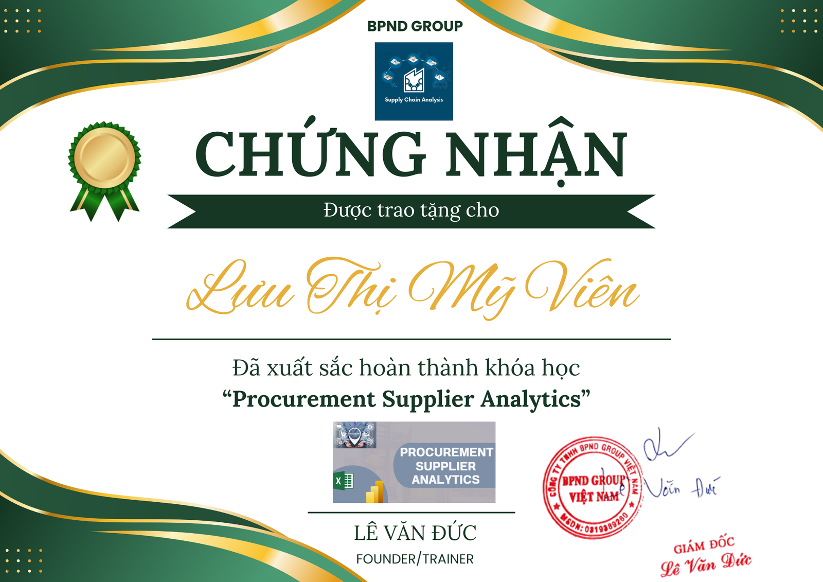 - Cấp chứng nhận hoàn thành khóa học Procurement Supplier Analytics - Phân tích mua hàng trong chuỗi cung ứng từ Bpnd Group Việt Nam.